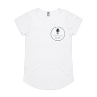 White Microphone Logo front and back on cotton female scoop T-shirt.